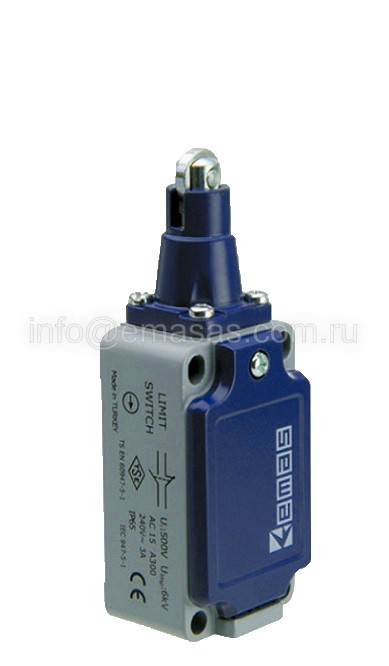 Выключатель концевой синхроного переключения линейный 3-х направленный с металлической консолью, стальным плунжером и роликом Ф13мм (1НО+2НЗ), L52K25MUM331 | код L52K25MUM331 | EMAS
