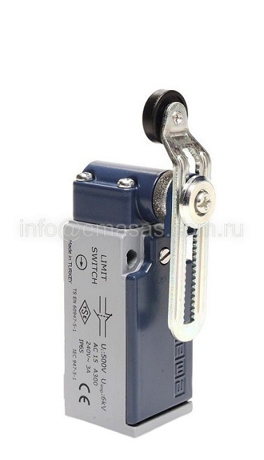 Выключатель концевой быстрого переключения угловой 2-х направленный с металлической консолью и пластиковым роликом Ф18мм на коротком регулируемом изогнутым рычаге (1НО+1НЗ), L51K13MEP124 | код L51K13MEP124 | EMAS