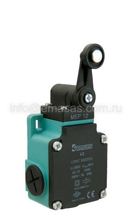 L2K13MEP121 Выключатель концевой быстрого переключения угловой 2-х направленный с пластмассовой консолью и пластмассовым роликом Ф18мм (1НО+1НЗ) | код L2K13MEP121 | EMAS
