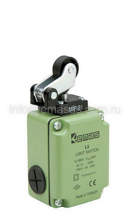 L1K13MIP211 Выключатель концевой быстрого переключения угловой 1-но направленный с пластмассовой консолью и упором с пластиковым роликом Ф22мм (1НО+1НЗ) | код L1K13MIP211 | EMAS