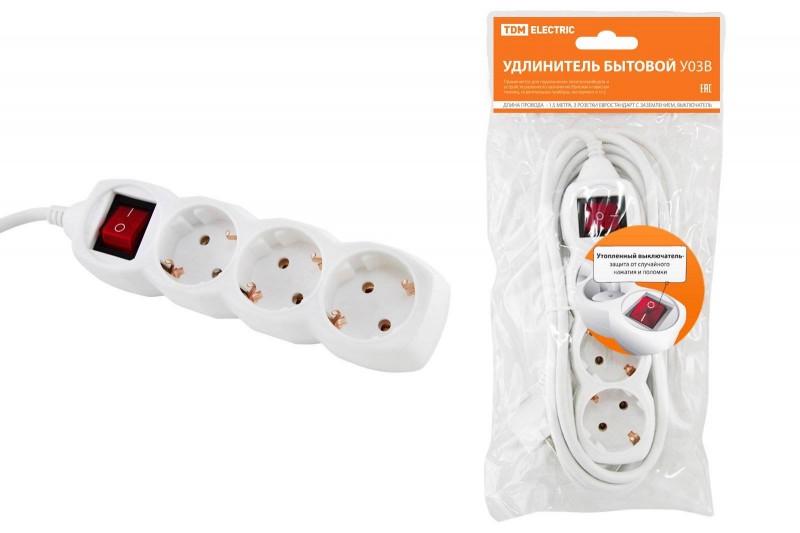Удлинитель бытовой У03В выключатель, 3 гнезда, 1,5метра, с заземлением, ПВС 3х1мм2 16А/250В TDM | код SQ1303-0100 | TDM