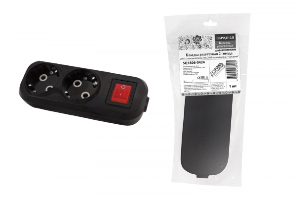 Колодка розеточная 2 гнезда 2П+3 c выключателем 16А 250В черная серии Народная | код SQ1806-0424 | TDM НАРОДНЫЙ