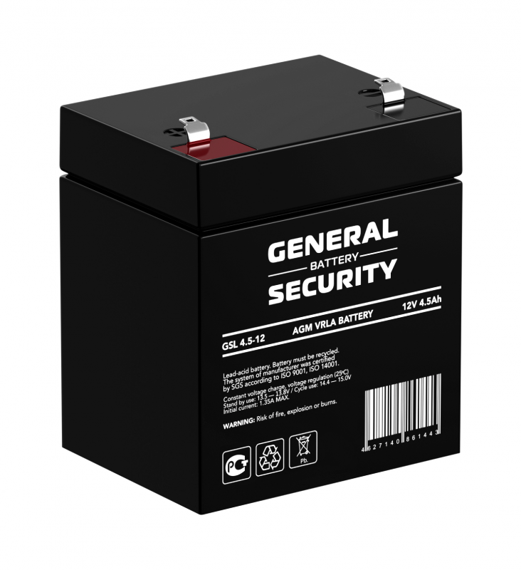 GSL4.5-12 Аккумуляторная батарея систем охраны и пожарной безопасности, напряжение: 12В, ёмкость: 4,5Ач, клеммы типа: F1, Размеры ДШВ: 90х70х107мм, вес: 1,6кг. Срок службы: до 8 лет. | код GSL4.5-12 | GENERAL SECURITY