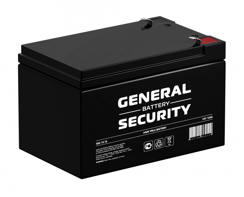 GSL12-12 Аккумуляторная батарея систем охраны и пожарной безопасности, напряжение: 12В, ёмкость: 12Ач, клеммы типа: F1, Размеры ДШВ: 151х98х98мм, вес: 3,68кг. Срок службы: до 8 лет. | код GSL12-12 | GENERAL SECURITY