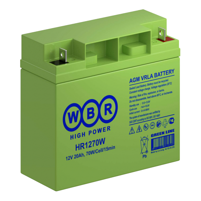 WBR HR12170W Аккумуляторная батарея для ИБП, напряжение: 12В, ёмкость: 45Ач, клеммы типа: F4 под болт и гайку М6, Размеры ВШГ: 171x166x199мм, вес: 14,5кг. Срок службы: 8 лет. | код WBR HR12170W | WBR