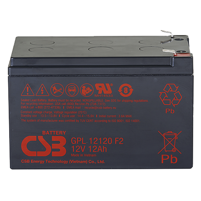CSB GPL12120 F2 Аккумуляторная батарея для ИБП, напряжение: 12В, ёмкость: 12Ач, клеммы типа: F2, Размеры ДШВ: 151х98х94,1мм, вес: 4,10кг. Срок службы: 8 лет. | код CSB GPL12120 F2 | CSB