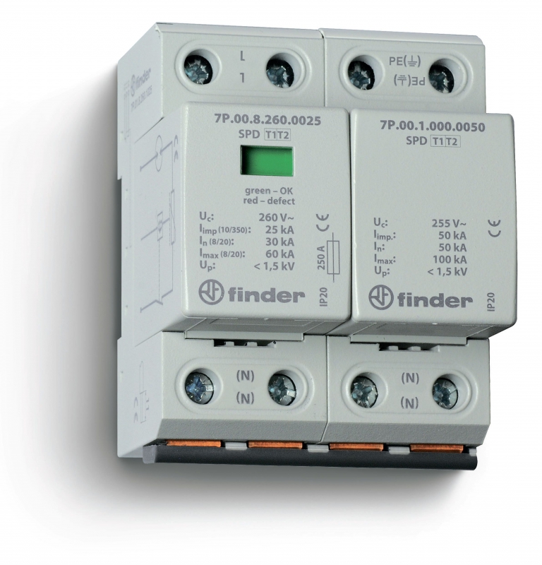 Устройство защиты от импульсных перенапряжений УЗИП тип 1+2 (1 варистор/искровый разрядник + 1 искровый разрядник), модульный, ширина 72мм, степень защиты IP20 | код 7P0282601025 | FINDER