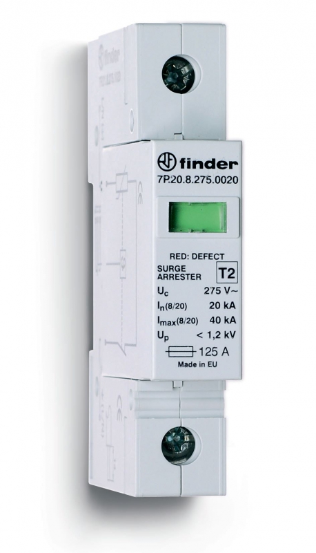 Устройство защиты от импульсных перенапряжений УЗИП тип 2 (1 варистор), Uc=130В AC, модульный, ширина 17.5мм, без доп.контакта, степень защиты IP20 | код 7P2181300015 | FINDER