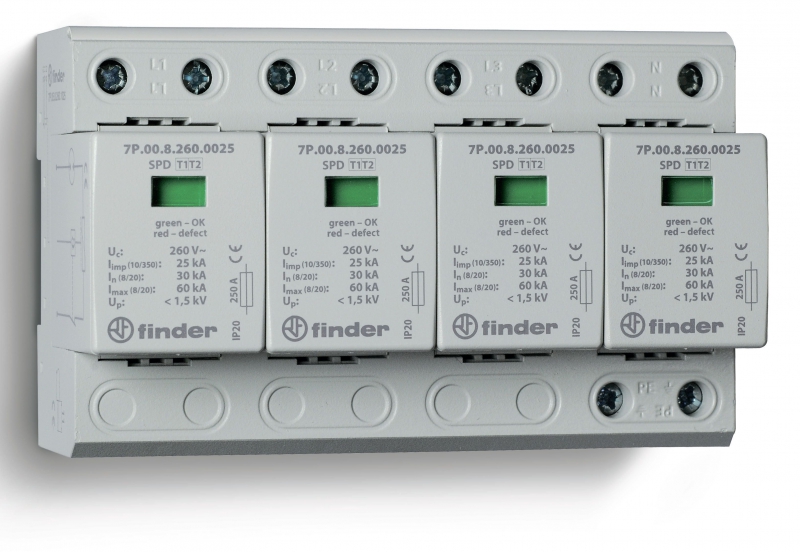 Устройство защиты от импульсных перенапряжений УЗИП тип 1+2 (4 варистор/искровый разрядник), модульный, ширина 144мм, степень защиты IP20 | код 7P0582601025 | FINDER
