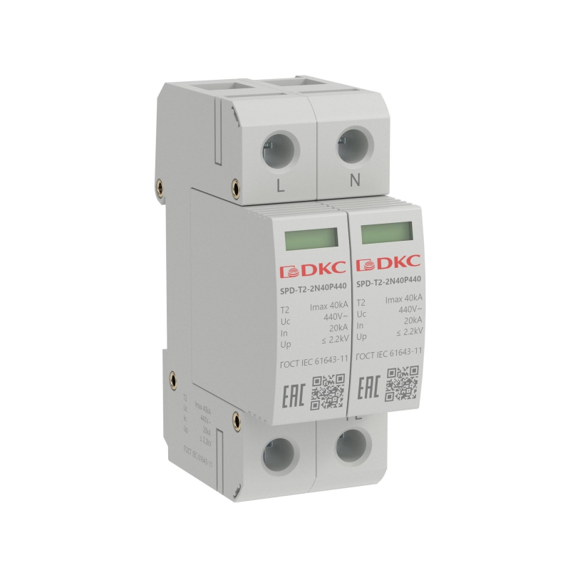 УЗИП, тип 2, 2 полюса, Imax 40kA, со сменным модулем, Un 440V | код SPD-T2-2N40P440 | DKC
