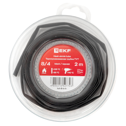Термоусаживаемая трубка ТУТ нг 8/4 черная ролик 2 м EKF | код tut-8-b-b | EKF