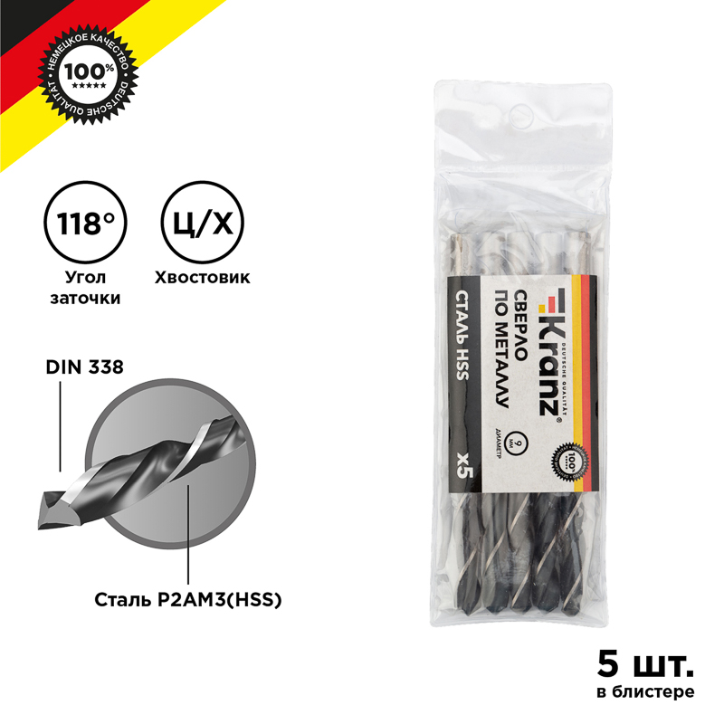 Сверло по металлу 9,0х125х81 мм HSS (5 шт. в упаковке) DIN 338 Kranz | код KR-91-0627 | KRANZ