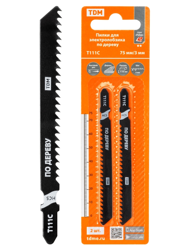 Пилки для электролобзика по дереву, HCS, 75х3 мм, быстрый рез, T111C, 2 шт, Рубин, TDM | код SQ1089-0204 | TDM
