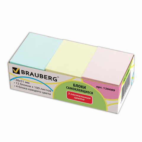 Блоки самоклеящиеся (стикеры) BRAUBERG, ПАСТЕЛЬНЫЕ 38х51 мм, 100 листов, НАБОР 12 шт., 3 цвета, 126689 | код 126689 | BRAUBERG