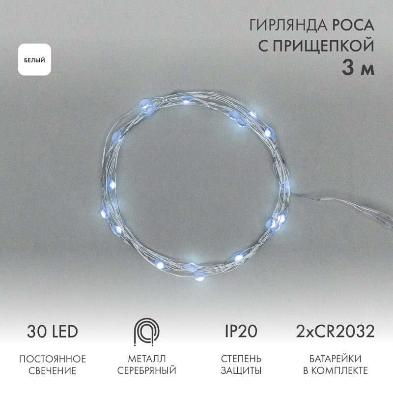 Гирлянда Роса с прищепкой 3 м, 30 LED, белое свечение, 2хCR2032 в комплекте NEON-NIGHT | код 302-015 | NEON-NIGHT