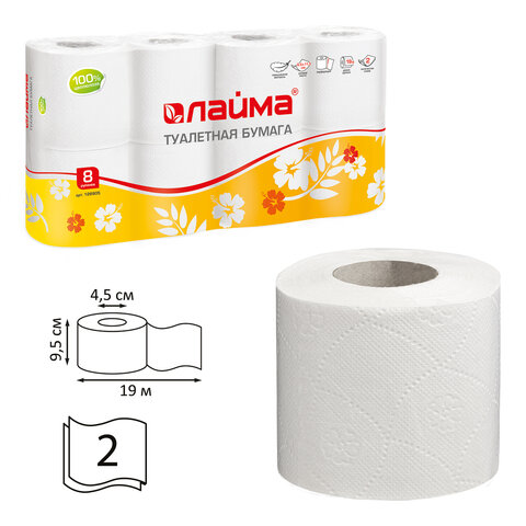 Бумага туалетная бытовая, спайка 8 шт., 2-х слойная, (8х19 м), LAIMA/ЛАЙМА, белая, 126905 | код 126905 | ЛАЙМА