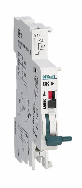 Контакт сигнальный СК-101 для автоматических выключателей серии ВА-101 DEKraft; предназначен для сигнализации аварийного срабатывания выключателя; тип контакта – переключающий; номинальный ток – 6 А; ном.напряжение – 220 В пер.тока; ширина – 9 мм; установ