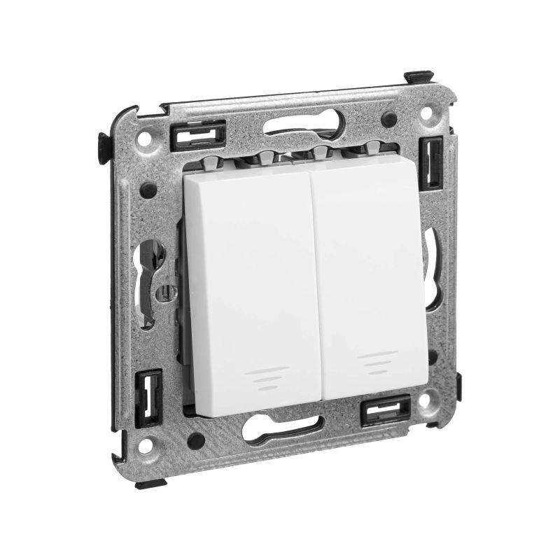 Кнопка двухклавишная. Назначение: для монтажа в подрозеточные коробки глубиной не менее 45 мм (код 59301). Используется в качестве кратковременного включения источника питания энергией. Характеристики: 2 модуля, диаметр отверстий для ввода кабелей – 3 мм
