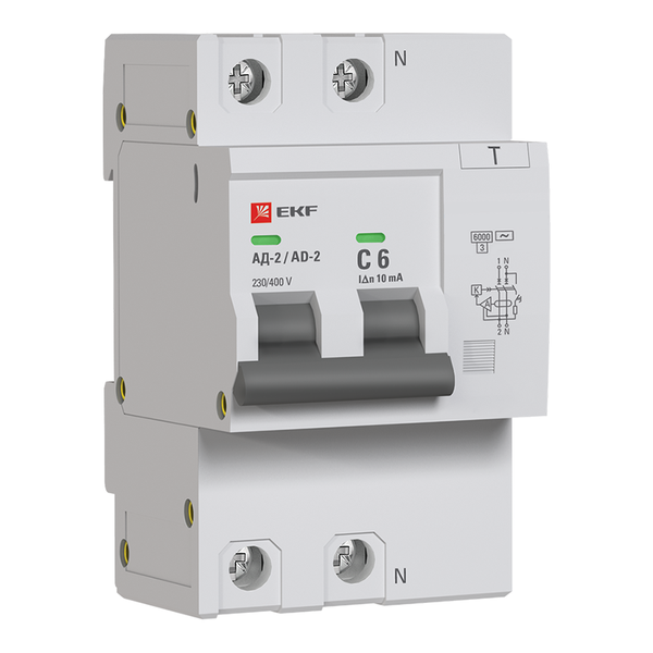 Дифференциальный автомат АД-2 6А/10мА (х-ка C, АС, электронный) 6кА EKF PROxima | код DA2-6-06-10-pro | EKF