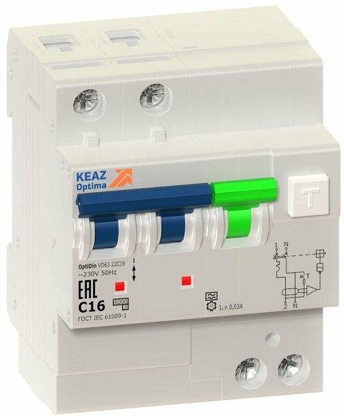 АВДТ с защитой от сверхтоков OptiDin VD63-22C16-A-ОМ4-РЕГ (2P, C16, 30mA) 10кА | код 361294 | КЭАЗ