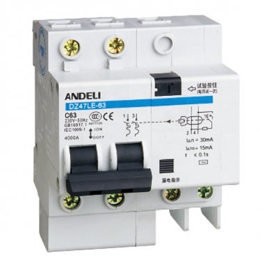Диф. Автомат DZ47LE-63 2P 63A 100mA тип AC х-ка С 6kA (ANDELI) | код ADL02-048 | ANDELI