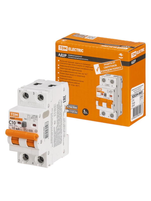Диф.автомат АД2P 2Р С10 10мА 6кА тип АС TDM | код SQ0204-0603 | TDM