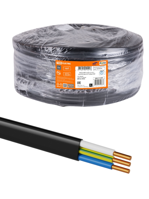 Кабель ВВГ-П нг(А)-LS 3х1.5 ок(N. PE)-0.66 ГОСТ (бухта 200м) | код SQ0117-0451 | РЭМЗ ТМ