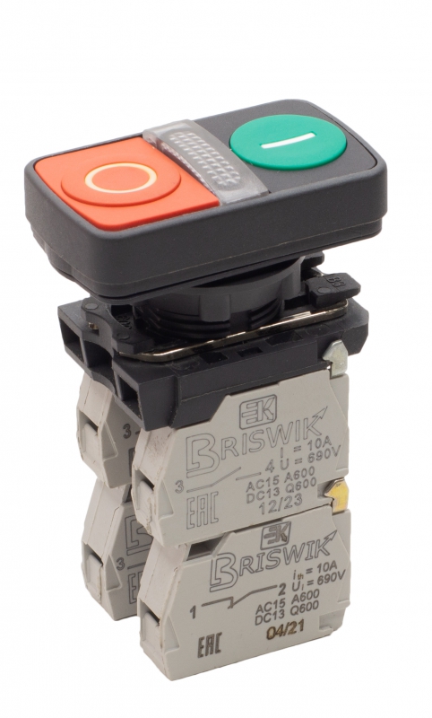 Выключатель Briswik КМЕ 8602м -Л 220В зел-красн IP65 УХЛ3 10А 0но+2нз | код aB-GB-5Ai-7623 | Briswik