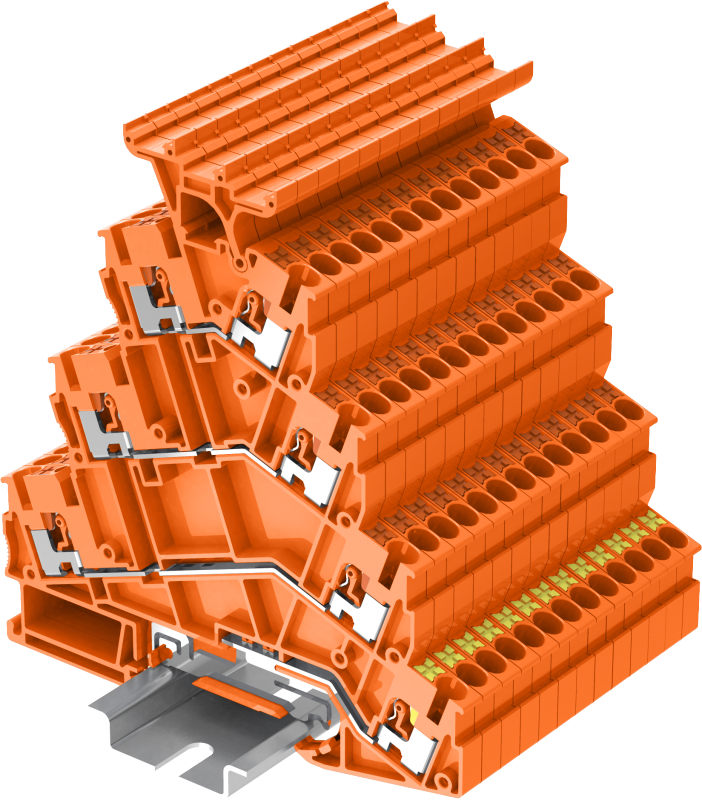 TPFS2.5-2T-OG Клемма TP 4-уровневая, угловая с держателем маркировки, с заземл., Push-in, сеч.2.5мм2, оранж., шт | код TPFS2.5-2T-OG | SUPU
