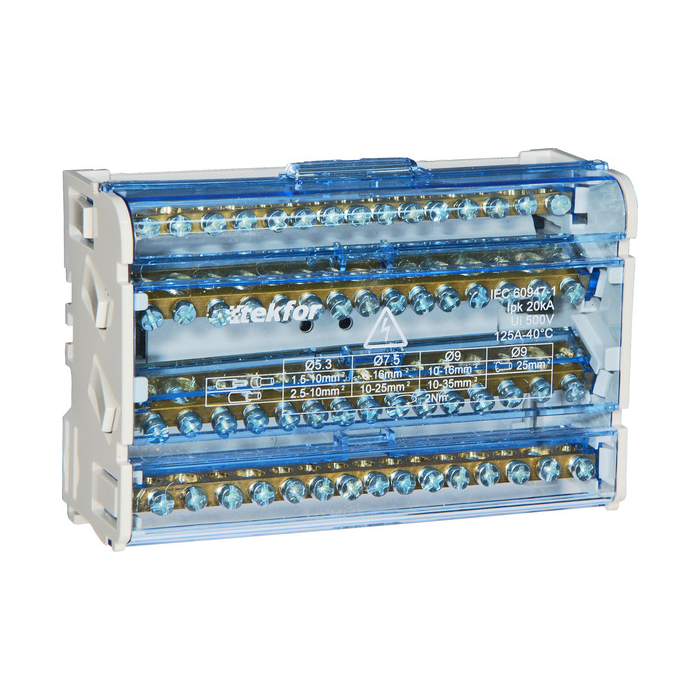 Шина нулевая в корпусе на DIN-рейку SNK-2-4-15-Ni, никелированная, в корпусе 4 шины по 15отв., крепление на DIN-рейку | код A8300-06-09-012 | РЕЛЕ И АВТОМАТИКА