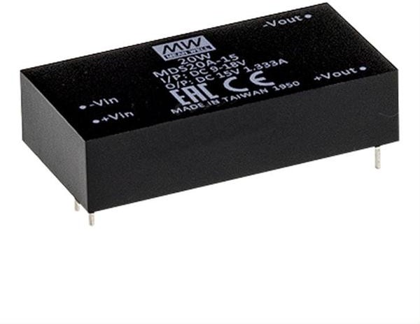 Источник питания DC-DC, 20Вт, вход 12В (9…18В) DC, потребление без/под нагр. 10мА/1950мА, выход 15В/1333мА, КПД 88%, ёмкостная нагр. макс. 800мкф, изоляция 4000В AC, в корпусе 50.8х25.4х12мм, -40…+90С | код MDS20A-15 | MeanWell
