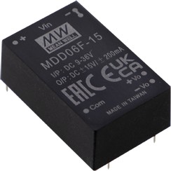 Источник питания DC-DC, 6Вт, вход 24,48В (18…75В) DC, потребление без/под нагр. 15мА/310мА, выход ±15В/±20…200мА, КПД 82%, ёмкостная нагр. макс. ±47мкф, изоляция 6000В DC/4200В AC, в корпусе 31.8х20.3х12.2мм, -40…+90С | код MDD06G-15 | Mean