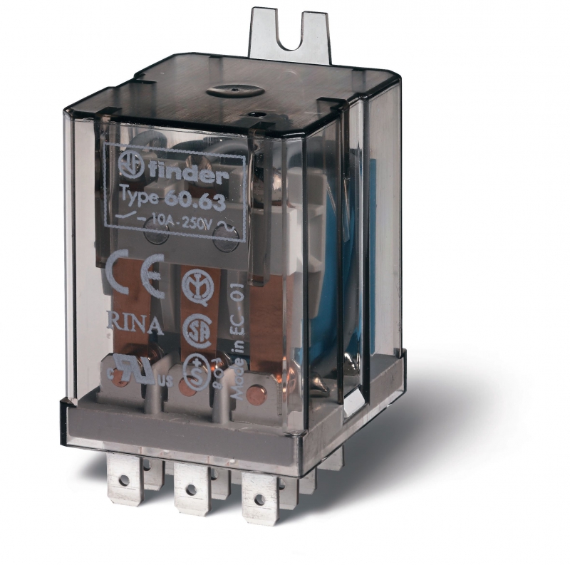 Универсальное электромеханическое реле, монтаж в наконечники Faston 187 (4.8х0.8мм), 3CO 10A, контакты AgNi, катушка 24В DC, степень защиты RTI, боковой монтажный фланец, опции: нет | код 606390240000 | FINDER