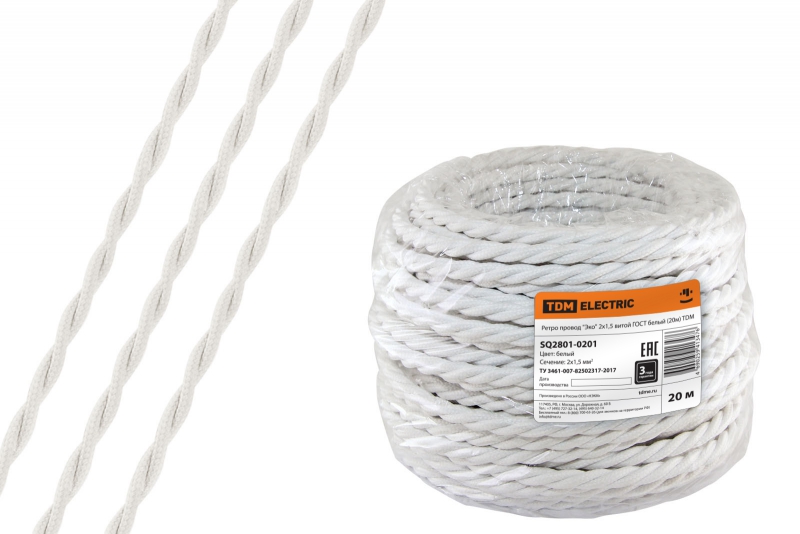 Ретро провод Эко 2х1.5 витой ГОСТ белый (бухта 20м) | код SQ2801-0201 | РЭМЗ ТМ