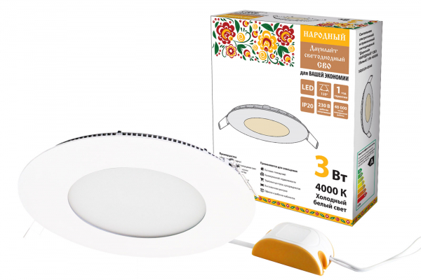 Светильник ультратонкий встраиваемый светодиодный Даунлайт НАРОДНЫЙ СВО (белый) 3 Вт 4000К | код SQ0329-0544 | TDM НАРОДНЫЙ