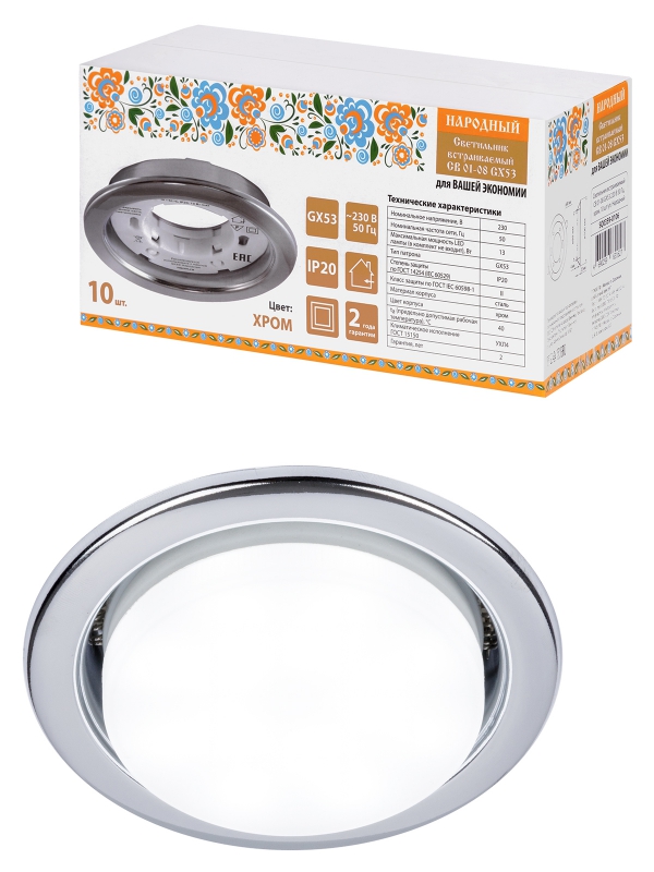 Светильник встраиваемый СВ 01-08 GX53 220 В 50 Гц, хром, 10 шт/уп, Народный | код SQ0359-0106 | TDM НАРОДНЫЙ