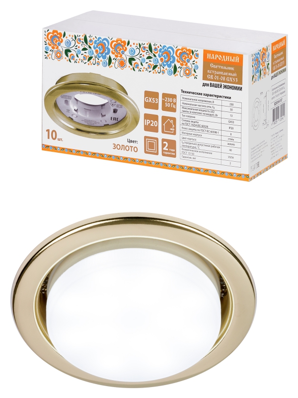 Светильник встраиваемый СВ 01-08 GX53 220 В 50 Гц, золото, 10 шт/уп, Народный | код SQ0359-0107 | TDM НАРОДНЫЙ