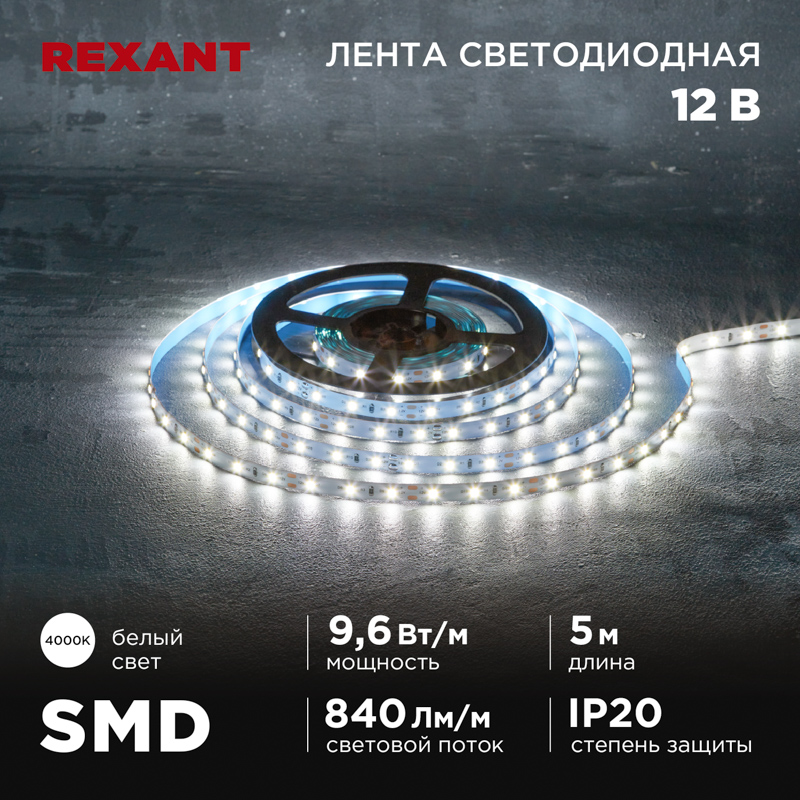 Лента светодиодная 12В, SMD2835, 9,6Вт/м, 60 LED/м, 4000K, 8мм, 5м, IP20 REXANT | код 141-214 | REXANT