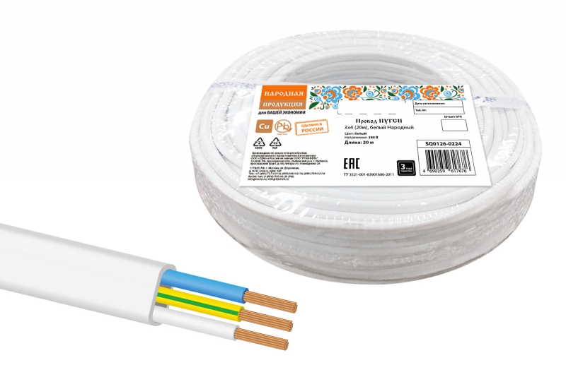 Провод ПУГСП (ПУГНП) 3х4 (бухта 20м) белый Народный ТРТС | код SQ0126-0224 | РЭМЗ ТМ