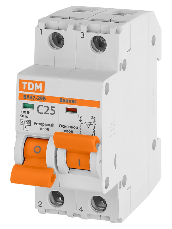 Авт. выкл. с мех. блок. (байпас) ВА47-29Б 1Р+1Р 25А 4,5кА х-ка C TDM | код SQ0206-0402 | TDM